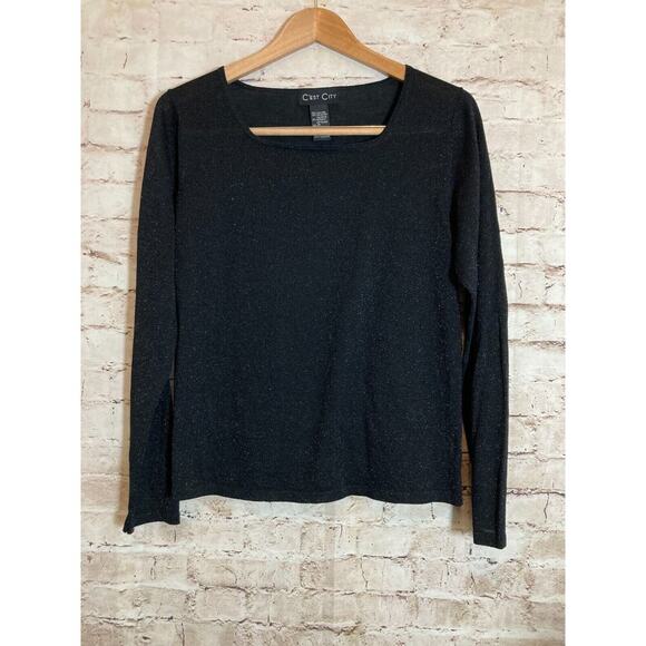 C'Est City Top Womens Medium Silk All Over Glitter Black Long Sleeve Stretch