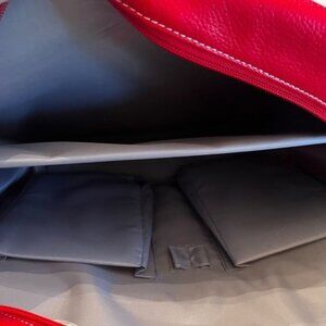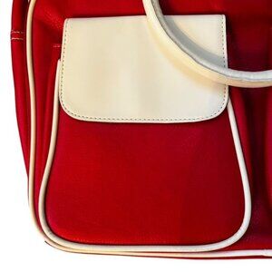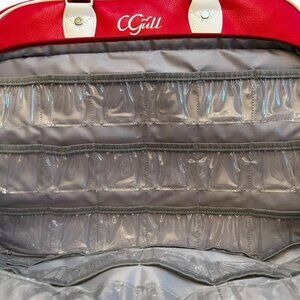 This CGull tote bag is used for storing and transporting all of your crafting needs with space for 72 cartridges and assorted pockets and space to store lots. Red leather with white trim. Measures approximately 18" long, 7" deep and 12" high, new without tags