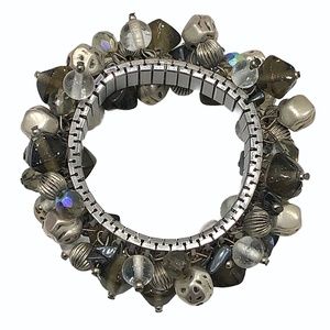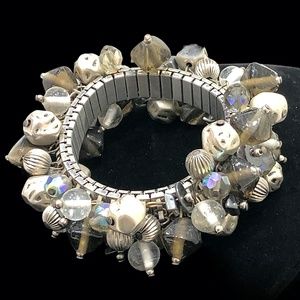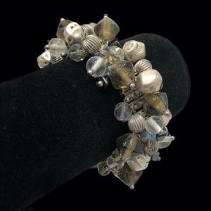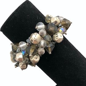Vintage stretch crystal, glass, and silver tone beads Cha Cha bracelet in very good preowned condition. This statement piece has clear, smokey, and gray glass beads. There are Aurora Borealis light gray crystals, hammered silver tone beads, and a shiny silver semi-precious bead. Opens to 6 1/2”W.