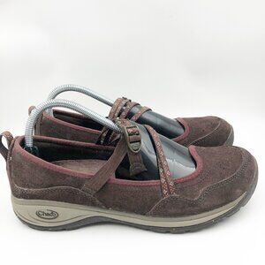 Chaco Petaluma Mary Jane Shoes. Brown leather suede outer, adjustable straps, size womens 9, wear on insole, wear/scuffs on outer. Smoke and pet free home.