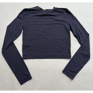 This top, which stops right above the waistline, has a closer fitting crew neck and narrow long sleeves for a seamless fit.