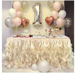 Ruffled champagne colored table skirt with Glitter Trim. Used for one party. Excellent condition. Comes with everything you need to attach to a 6 to 8 foot long party table.