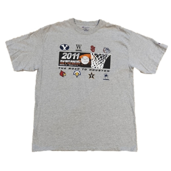 Gray vintage Champion Authentic Athletic Apparel "2011 NCAA Men's Basketball 2nd & 3rd Rounds, the Road to Houston, NCAA Final Four Houston 2011" short sleeve novelty T-shirt. Size XL. 90% Polyester, 10% Cotton. In excellent condition.