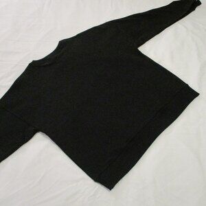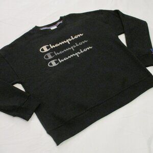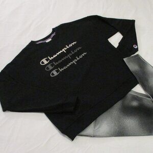 Very nice black sweatshirt with triple CHAMPION BRAND NAME on front: Silver Grey Sparkle, Dark Grey, and Medium Grey. The top brand name logo is sparkle shimmer; Medium weight. This sweat can go with any color. Leggings, Jeans, Shorts or Denim Skirts (you can wear opaque tights during winter or cooler weather if desired), Boots, Jackets, Accessories, and Shoes are in listings as well. Crew neck: embroidered logo on lower left sleeve. Will fit large based on measures, and desire for fit (Generous in size).