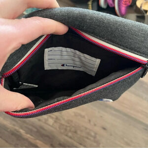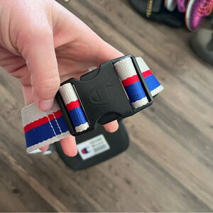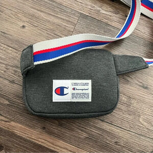 DETAILS: Champion belt bag, fanny pack. Zip closure, red white blue stripe strap, plastic side release buckle.