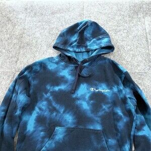 This Champion sweatshirt hoodie features a trendy blue dye design, with a drawstring tie and pullover style. Made from a cotton-poly blend, it offers both comfort and durability, making it ideal for casual wear or layering during cooler weather.