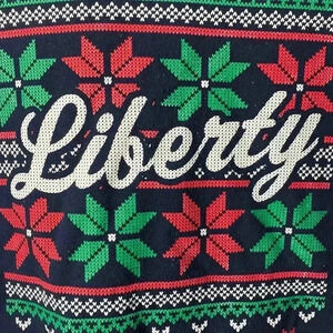 CHAMPION ECO FLEECE MENS SIZE LARGE NAVY SWEATSHIRT LIBERTY CHRISTMAS DESIGN. LENGTH MEASURES APPROX 28” FROM SHOULDER TO HEM SLEEVES MEASURE APPROX 26” CHEST MEASURES APPROX 2 FROM SIDE TO SIDE CLEAN