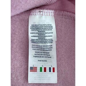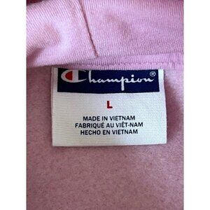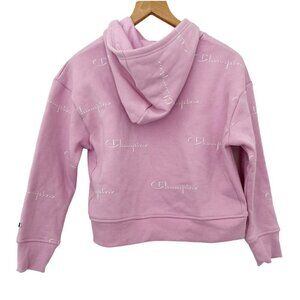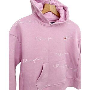 Champion girls light pink pullover hoodie. Hoodie has a front kangaroo pocket and an allover white script logo print. It's made of a cotton poly blend and is a girl's size medium. Hoodie is brand new with tags.
