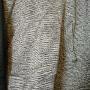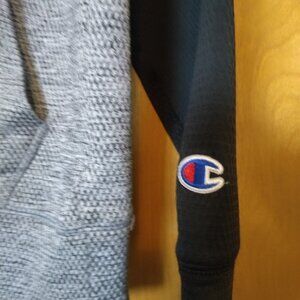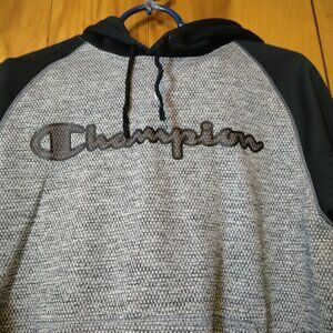 Champion men's size Small long sleeve hooded sweatshirt is made of 100% polyester. It has gray body with black sleeves, kangaroo pocket and Champion written on the chest, logo on one sleeve.