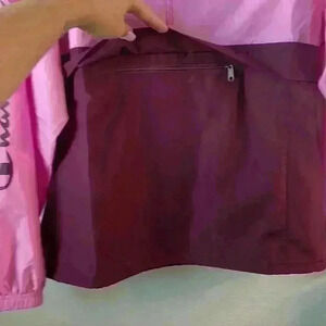 Water & water, and wind resistant. This garment is made with a portion of recycled fibers. Size small. Brand new with tags lightweight pink and maroon half zip up windbreaker hoodie.