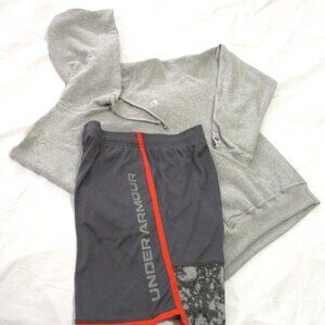 Grey hoodie with front pouch pocket, drawstring hood with ribbed cuffs, and waist.