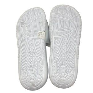 Champion Super Slide Split Script sandals. Synthetic strap with "Cham" script on right strap and "pion" script on left strap. Molded footbed with repeating, imprinted Champion "C" logo. Rubber outsole with treading detail and Champion logo. Imported.
