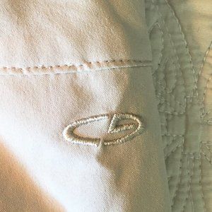 Soft, Breathable poly fabric, zip front and button fly skirt. Belt loops, 2 front slash pockets and one back pocket. Center back skirt vent. Embroidered logo on back hip. Needs a little pressing (don't we all?!!?), and you'll be off and running in style!