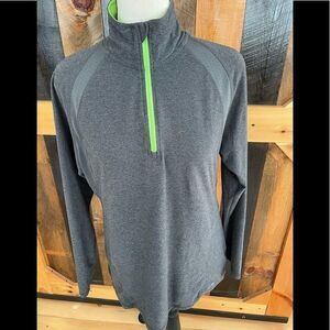 Champion zip front long sleeved top with neon accents. Gray with green, size M. Stand up collar, stretch inserts at armpits and the back. Ruffle detail down the back, polyester spandex blend. Approximate measurements are pit to pit flat 19”.