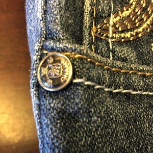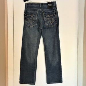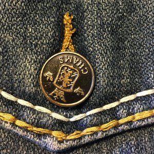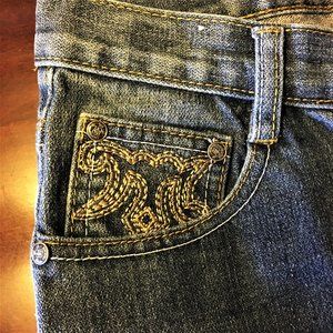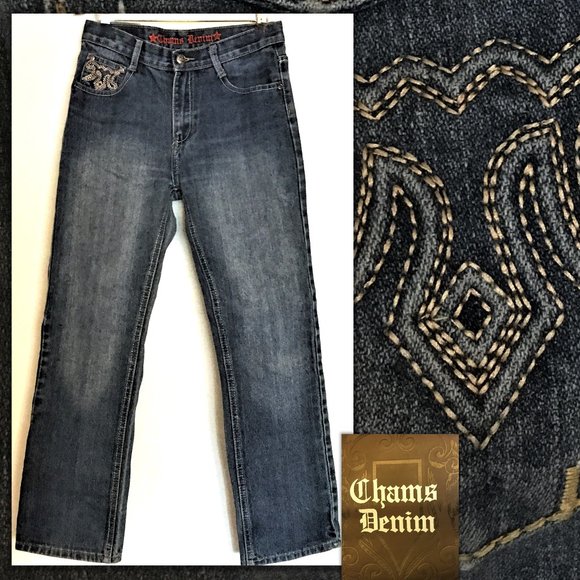 A slim fit and contrast stitching make these CHAMS jeans a street style upgrade! Distressed blue wash with heavy embroidered details at back flap/button pockets and coin pocket. Branded buttons, rivets and back leather patch.