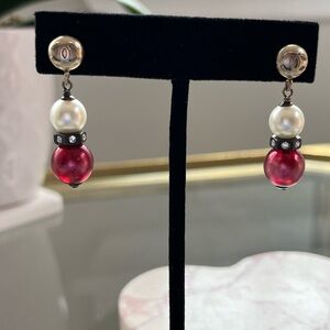 CHANEL 04P Pearly Red and Crystal Gold Hardware Drop Dangle Earrings Vintage