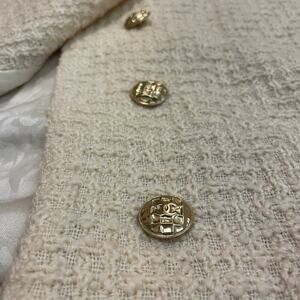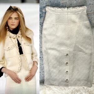 Crafted from Chanel’s iconic cream wool tweed, this high-waisted silhouette is tailored to perfection with a gold braided chain waistband, fully lined camellia jacquard silk interior, and a striking row of four embossed gold CC buttons along the rear vent — a dramatic couture touch rarely seen outside of runway releases. Rear zipper closure with CC logo pull.