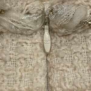 Crafted from Chanel’s iconic cream wool tweed, this high-waisted silhouette is tailored to perfection with a gold braided chain waistband, fully lined camellia jacquard silk interior, and a striking row of four embossed gold CC buttons along the rear vent — a dramatic couture touch rarely seen outside of runway releases. Rear zipper closure with CC logo pull.