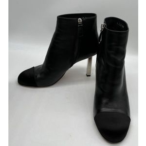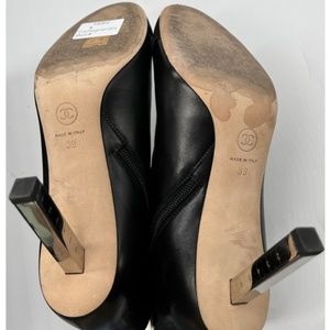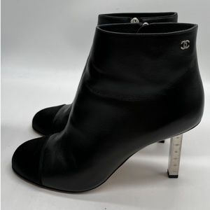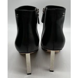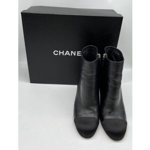 CHANEL 16K Black Leather Ankle Bootie w/ Satin Cap Toe and Ruler Heel sz 39