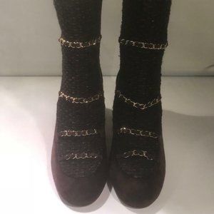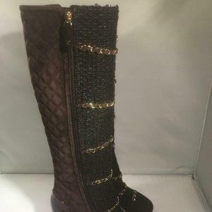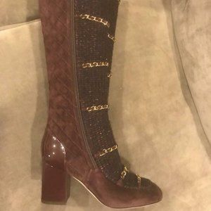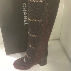 Suede and tweed knee high boots. Quilted suede back. Goldtone Chains detail the front. Full zip on each side with CC embossed zipper pulls. Patent leather block 2.75" heel. Padded leather insole and leather sole. Made in Italy. Designer color: Brown/Burgundy.