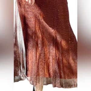 True Chanel elegance can be appreciated on this Fall 1999 Chanel trumpet gown. The dress is lined in a bronze iridescent opaque fabric with a beautiful sheer brown lurex overlay. Overlay has a perforated rectangle pattern and all the sewn in lurex is the perfect pop. Spaghetti strap trumpet style dress with bias cut panels at the hem for added movement. This dress zips up the back and is finished with signature CC copper buttons.