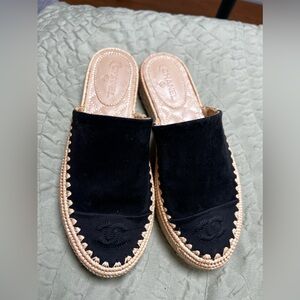 Step out in style with these Chanel black espadrille slides. Perfect for casual outings, these shoes offer both comfort and elegance.