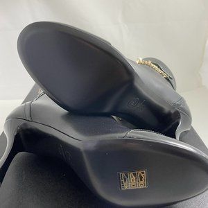 Chanel black lambskin/patent leather boots with gold chain and charms.