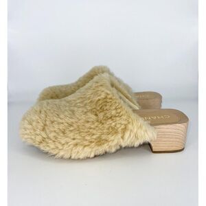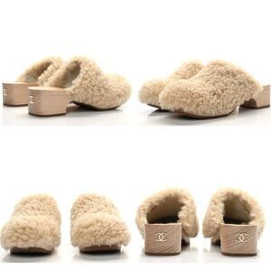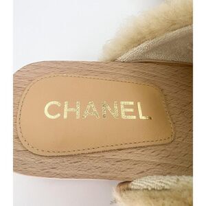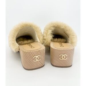 CHANEL 2022 Beige SHEARLING LAMBSKIN CC Logo Fuzzy Low Heel Clogs Size E…