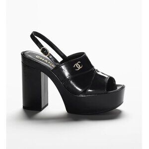 CHANEL 2023 MÉTIERS D’ART PATENT LAMBSKIN BLACK SLINGBACK PLATFORM SANDALS 39