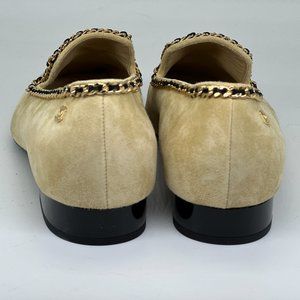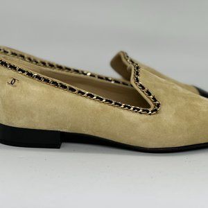 Suede calfskin slip on loafers feature a black patent leather cap toe and interwoven goldtone chain and patent leather trim around the opening. Goldtone CC logo on the sides. 0.5" black patent leather heel. Padded leather insole and leather sole. Designer color: Beige, Black. Made in Italy.