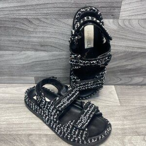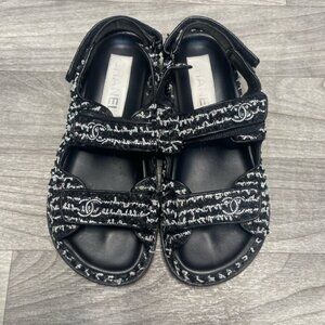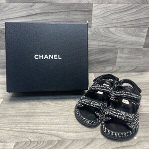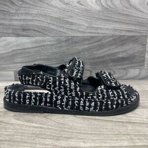 CHANEL Dad Sandals in black & white tweed, size 38 (US 8). Features iconic double C logo on straps. Comes in original box. Pre-owned with signs of wear (see photos), Step into luxury with these iconic CHANEL Dad Sandals in black and white tweed. Designed with comfort and style in mind, they feature the signature interlocking CC logos across all three Velcro straps and a soft leather footbed. These are size 38, which fits like a US 8. These sandals are pre-owned and do show wear, primarily on the insoles and soles.