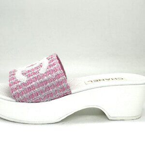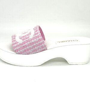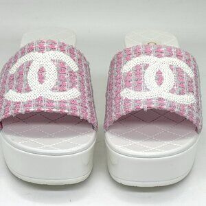 CHANEL 24P Tweed Sequin CC Patent Wedge Heel Mule Slide Platform Sandals