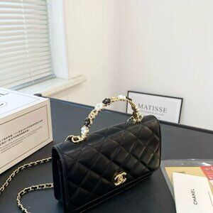 CHANEL 24P Spring/Summer Women's Black Quilted Leather Crossbody Handbag with Gold Buckle and Chain, Shiny Crinkled Lambskin, and Faux Pearl Metal.