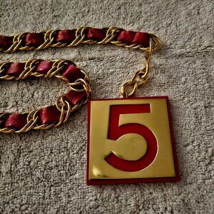 Authentic CHANEL #5 Belt. This is a very RARE ITEM. This is from there 1987 runway show. It is 22kt gold plated with calfs leather. The front of the number 5 is acrylic, to protect it. I purchased this item at an estate sale in La Jolla California. The belt was in its original box with the store tag still attached ( I. Magnin ) This Store has been closed for many years. The closet was climate controlled and the belt is in perfect condition. The belts markings are on the hook of the belt. In 1985 CHANEL started to put serial numbers on there handbags. However they didn't put serial numbers on there belts and other accessories until 1990. This is an exceptional find. And I have only seen one other item like this.
