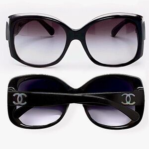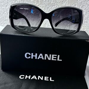 Authentic Limited Edition Chanel 5227-H 1299/3C Sunglasses. Oversized Black on Mother of Pearl CC Temple Logo. A few minor scuffs on lenses and frame. Overall condition is very good. Beautiful looking classic and iconic CHANEL. Includes sunglasses case. Will try to ship with box but may not be the original. All pictures are of the sunglasses you will receive.