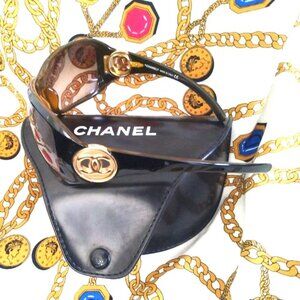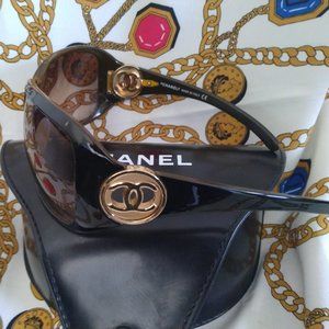 Pre-owned authentic Chanel sunglasses, both lenses have Chanel engraved in corner and sides. Overall excellent with a couple of scuffs and light scratches, one on left lens that is low on the side that does not affect visual field.