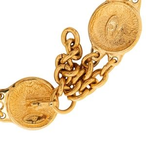 This is a gorgeous vintage 1980s gold-plated Chanel choker necklace with 7 circular sunburst CC logo medallions throughout and a hook and eye closure.