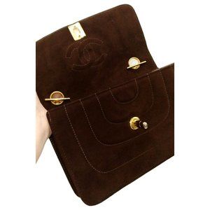 Classic rare 1980s authentic Chanel bijoux chain flap bag features 24K gold hardware and a bijoux chain shoulder strap. The 24K gold turn-lock opens to a matching gold shoulder cross body strap, with a luxurious chocolate brown suede leather quilted exterior, buttery soft lambskin interior, and stitched CC logo under the opening flap.