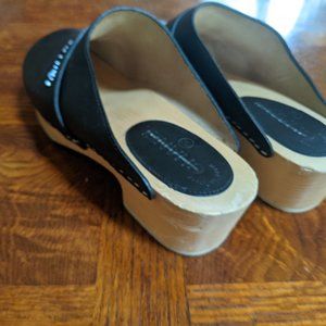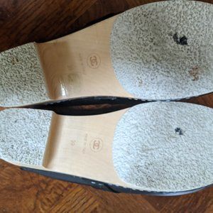 CHANEL classic clogs in black leather and wood sole. Just in time for Fall , these clogs go with everything. EU size 39. Sadly, my pup got ahold of them so a few bit marks on the wood at the heel (pic shown, so is the pup). No one will no that but you! (I've had plenty of good comments since). Vednor label is defaced (shown). Other than that, these are in great shape. Vendor label is defaced, Made in Italy, and the shoe sticker is still attached! I'm a five star rated seller. Serious offer only please.