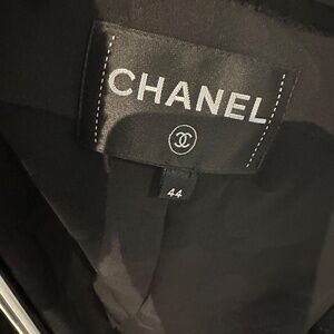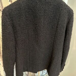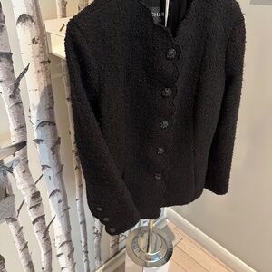 THIS ELEGANT BLACK CHANEL JACKET IS BOTH STYLISH AND ELEGANT. THIS ITEM WAS WORN ONLY ONCE AND IS IN FABULOUS CONDITION. THE ICONIC CHANEL BUTTONS ON A SCOLLOPED FRONTIS STUNNING
