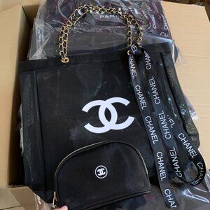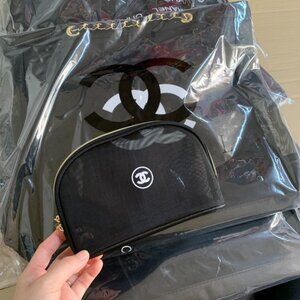 CHANEL Beauty Black Mesh Tote Bag & Makeup Pouch Set of 2 GWP Gift w/ Gold Hardware NEW