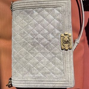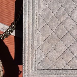 Karl Lagerfeld designed the Boy Collection as an interpretation of the boyish charm that Coco Chanel was known for. Karl was stated as saying that the very spirit of Chanel was inspired by Boy Capel, the love of her life; which is why this new collection is called the "Boy Chanel." This gorgeous bag from the pre-Fall 2013 collection is made of gorgeous beige distressed and quilted Nubuck leather with a subtle metallic sheen. This is the largest size of the collection and features a long chain-link strap with a leather pad that can be used as a long strap or looped around as a shoulder bag.
