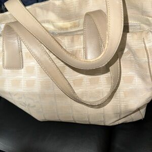 Stylish beige tote with iconic CHANEL logo pattern. Perfect for everyday use. Complements any outfit. Conditions/callouts: Leather handles, No cracking on handles some signs of scratches,and rubbing, little ink stain, Maybe some signs of cracking(can barely see it), Bottom of outer bag is clean, all feet’s are intacted, no major call out on the piping of the bag, appears to be light rubbing/peeling, outer bag has some sign of stains (can barely see) Inner bag has some signs of stain and ink marks, pockets appears to have some stains.,PLEASE SEE PHOTOS BEFORE PURCHASING.