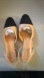 Elegant beige flats with black toe cap. Features slingback design. Iconic CHANEL branding.