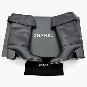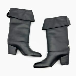 CHANEL 2020 Black 20k Heeled Foldover Boots Size 40 US 9-9.5 Interlocking CC Logo Leather Cap Toe