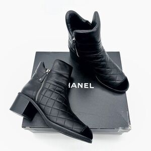 CHANEL Black CC Logo Quilted Ankle Boots Size 39 Velvet Cap Toe Zip Moto Leather