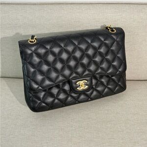 This CHANEL Classic Flap Jumbo is crafted from durable black caviar leather with polished gold-tone hardware, giving the CC turn-lock and chain strap a radiant shine. The diamond quilting and timeless silhouette make it one of the most coveted CHANEL classics. In very good condition with minor natural creasing on the front, structure slightly relaxed, and hardware professionally polished. A timeless piece that adds refined elegance to any look.