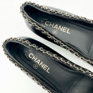 CHANEL Black Chain Ballet Flat Size 38 CC Logo Leather Grosgrain Pointed Toe Shoes
