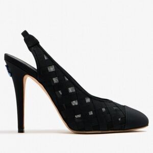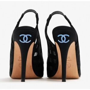 Stay trendy in these iconic sandals from Chanel. Crafted using black quality fabric in a stylish mesh design, it features a diamond pattern, cap toe, slingback straps, and stiletto heels. Gain a great contribution towards your wardrobe.