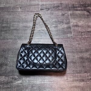 Sophisticated CHANEL shoulder bag in black quilted design. Features elegant gold chain straps and iconic logo clasp. Does have some wear on the inside. The outside is still very alluring! ❤️ Any questions just let me know!